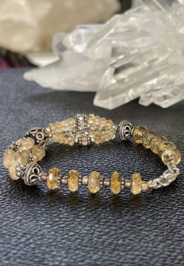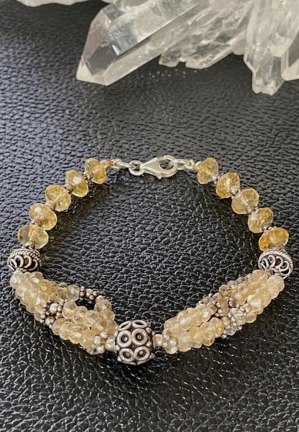 Armband met Gouden Topaas edelstenen, facet geslepen kralen, met onderverdeling in meerdere lijnen, met ertussen bewerkte zilveren bolletjes en kralen en met zilveren sluiting