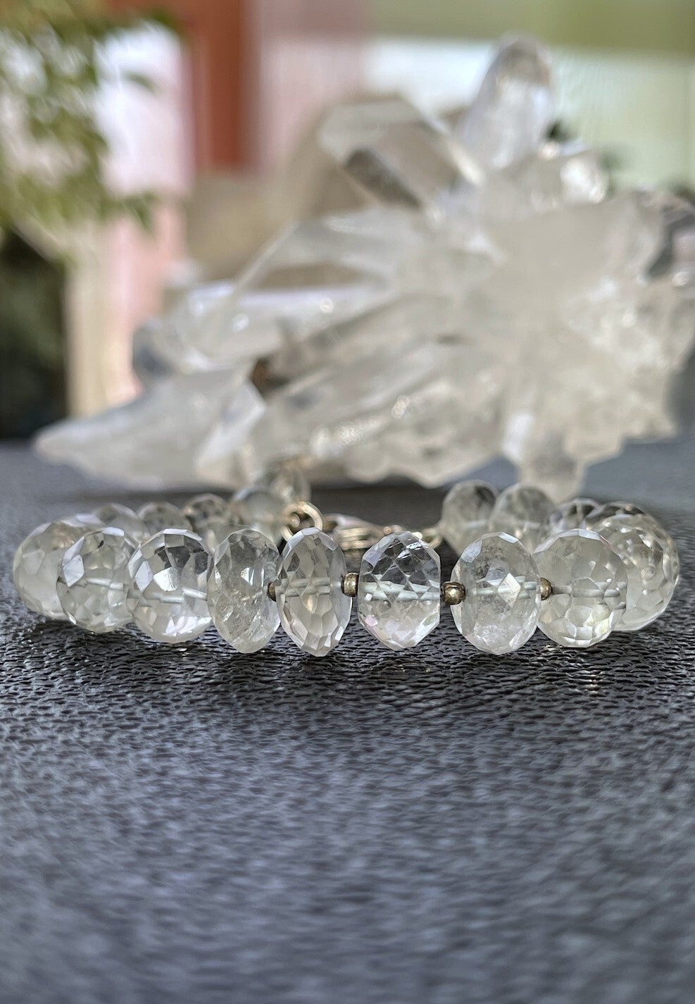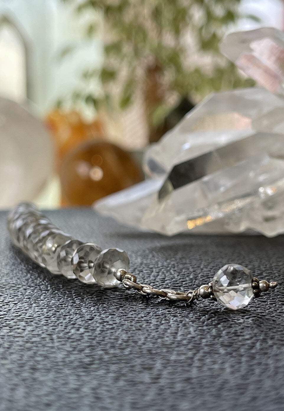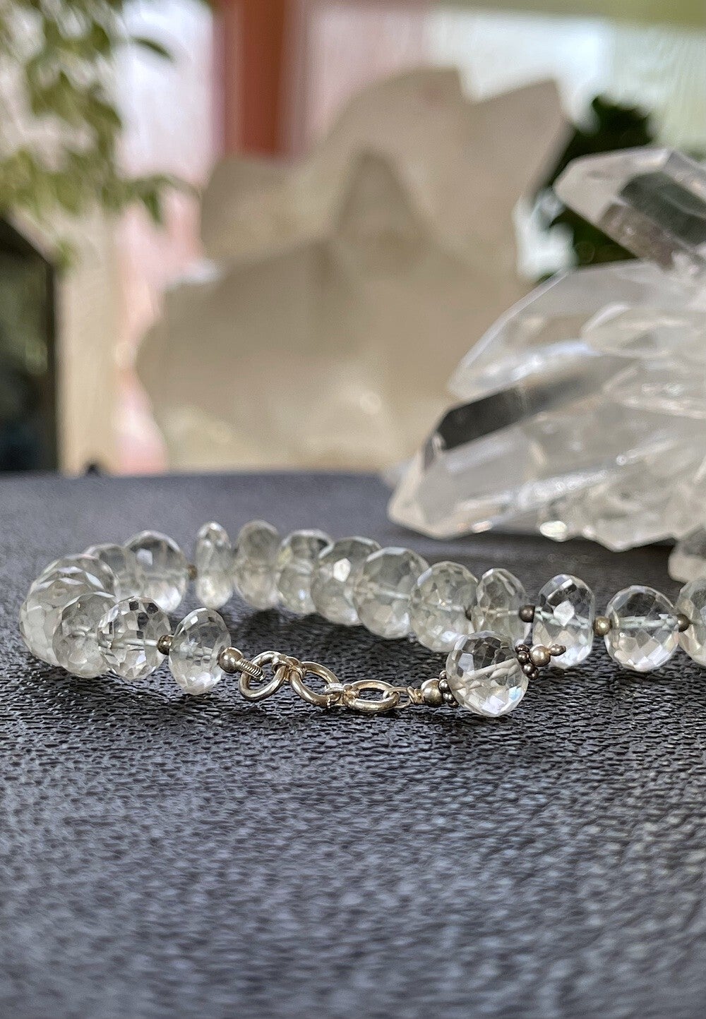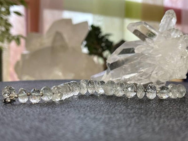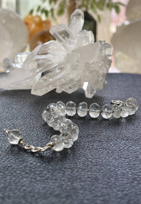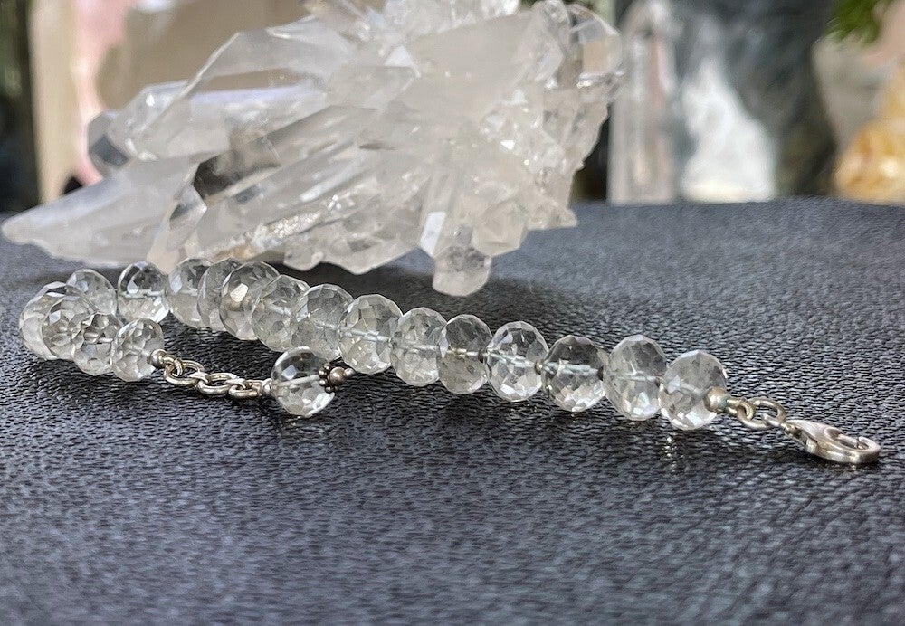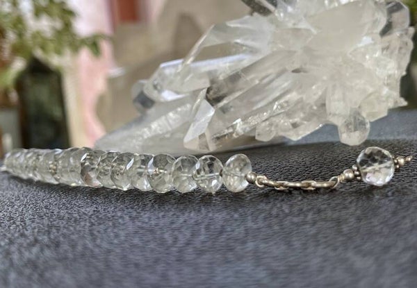 Armband met Bergkristal edelstenen, facet geslepen kralen met zilveren kralen ertussen en met zilveren sluiting, verstelbaar in lengte, mooie kwaliteit