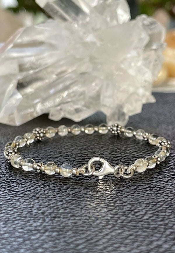 Armband met Bergkristal edelstenen, ronde cabochon kralen met bewerkte zilveren kralen ertussen en met zilveren sluiting