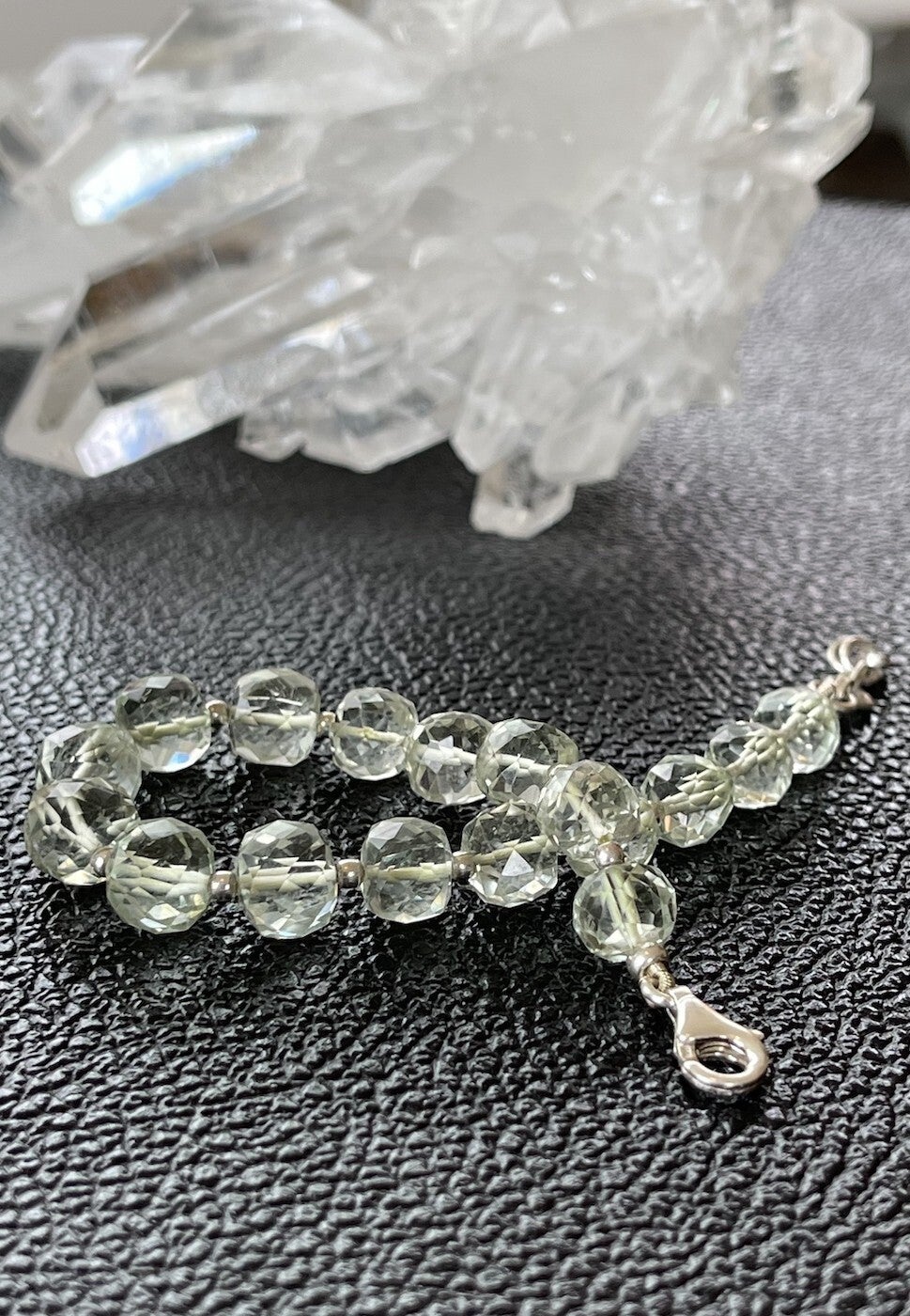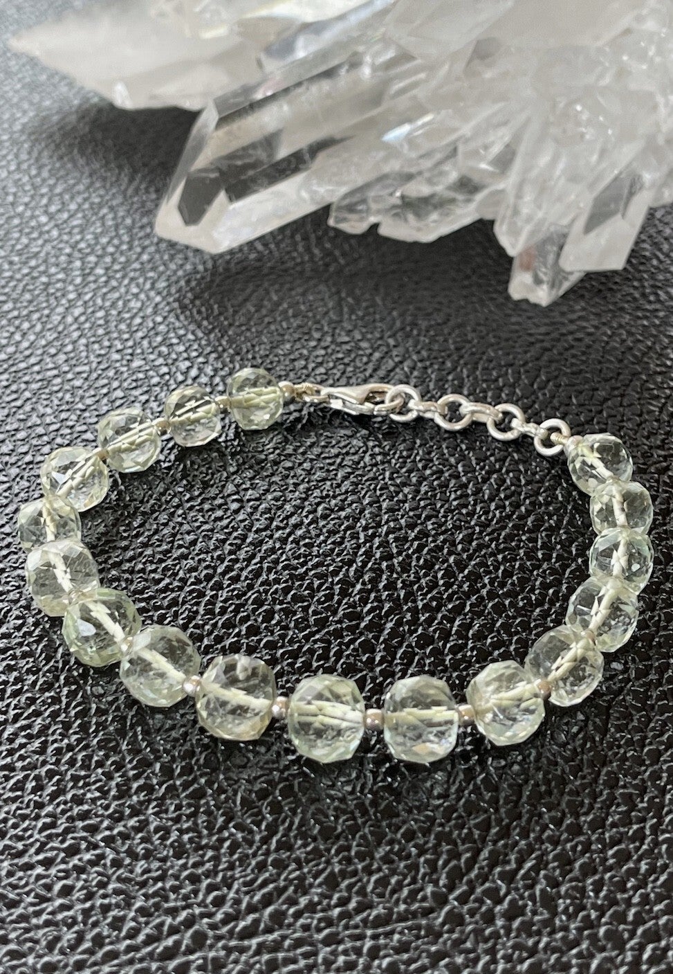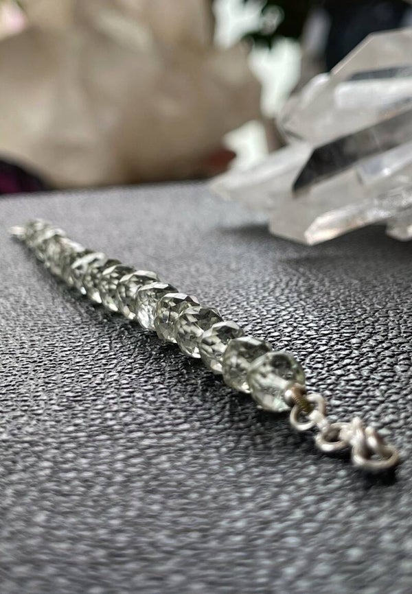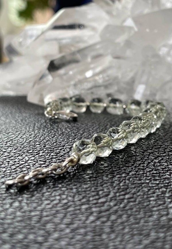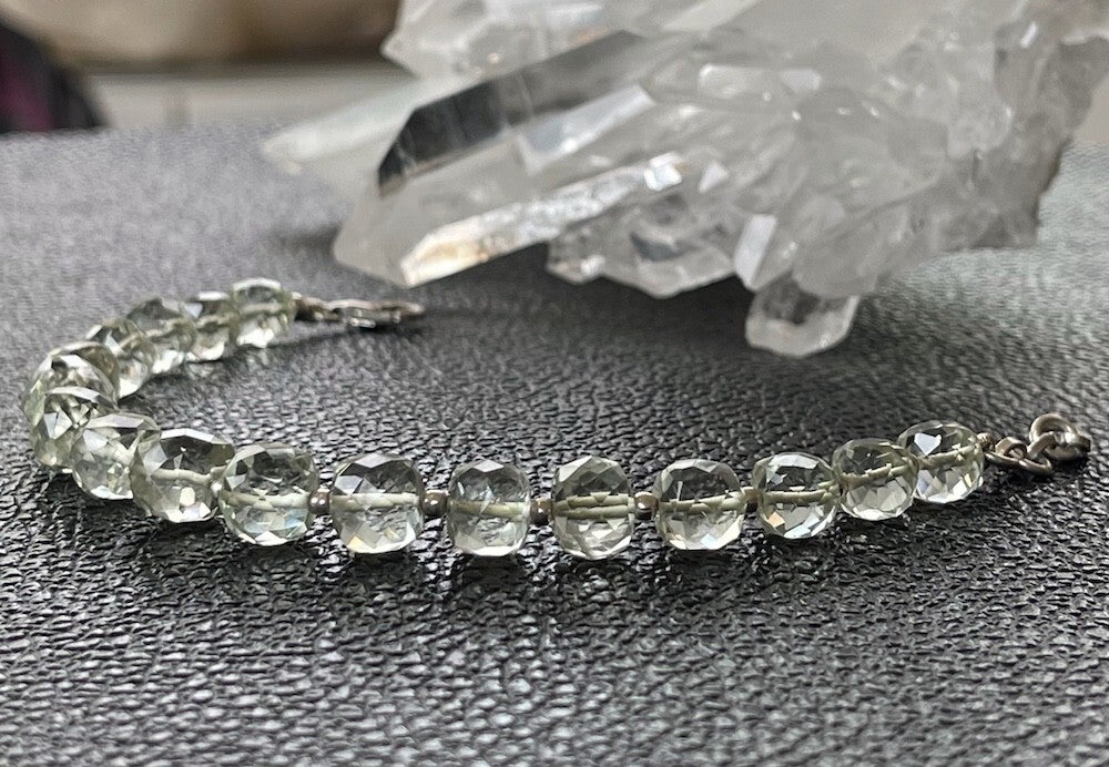 Prachtige armband met groene Amethist edelstenen, facet geslepen kralen met zilveren kralen ertussen en met zilveren sluiting, verstelbaar in lengte
