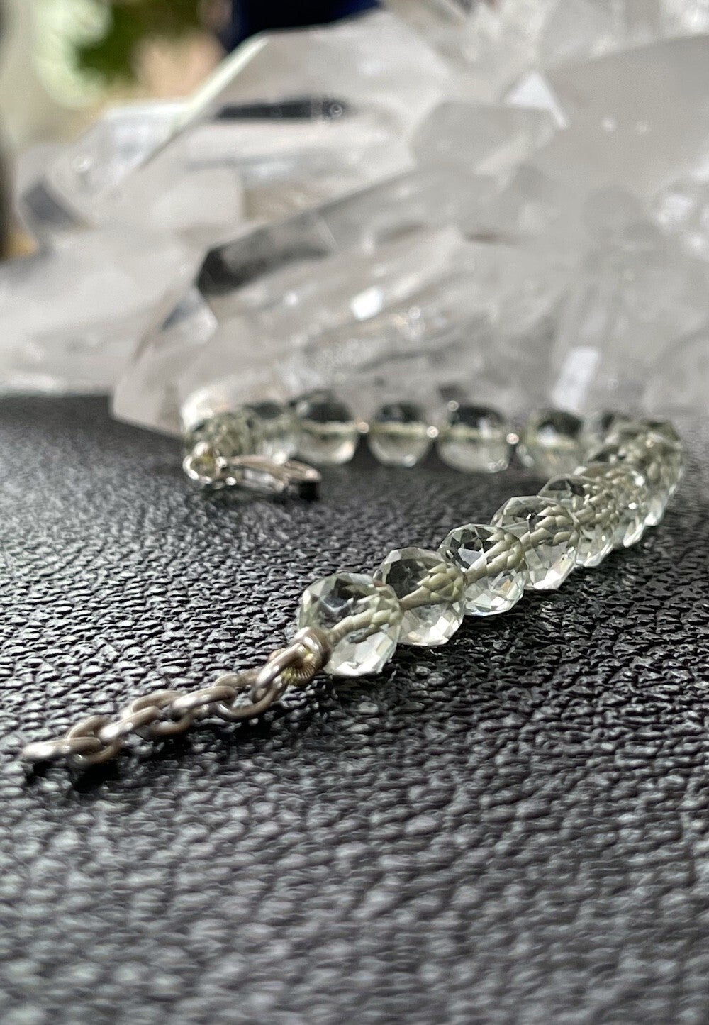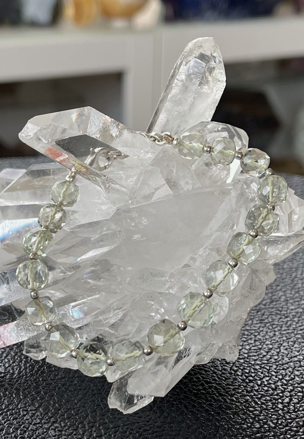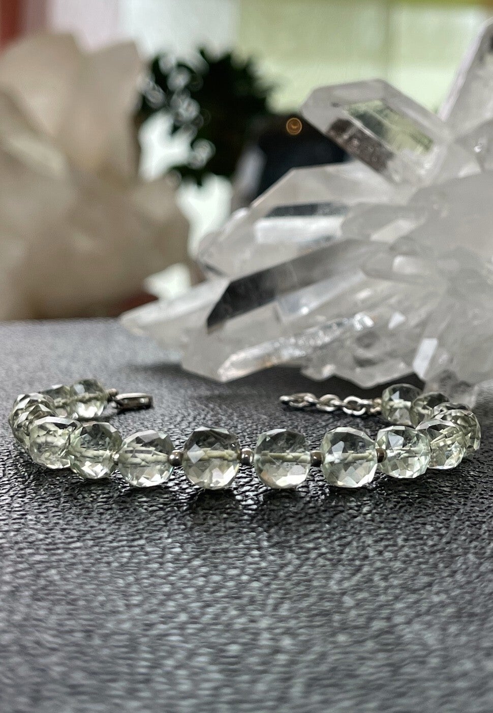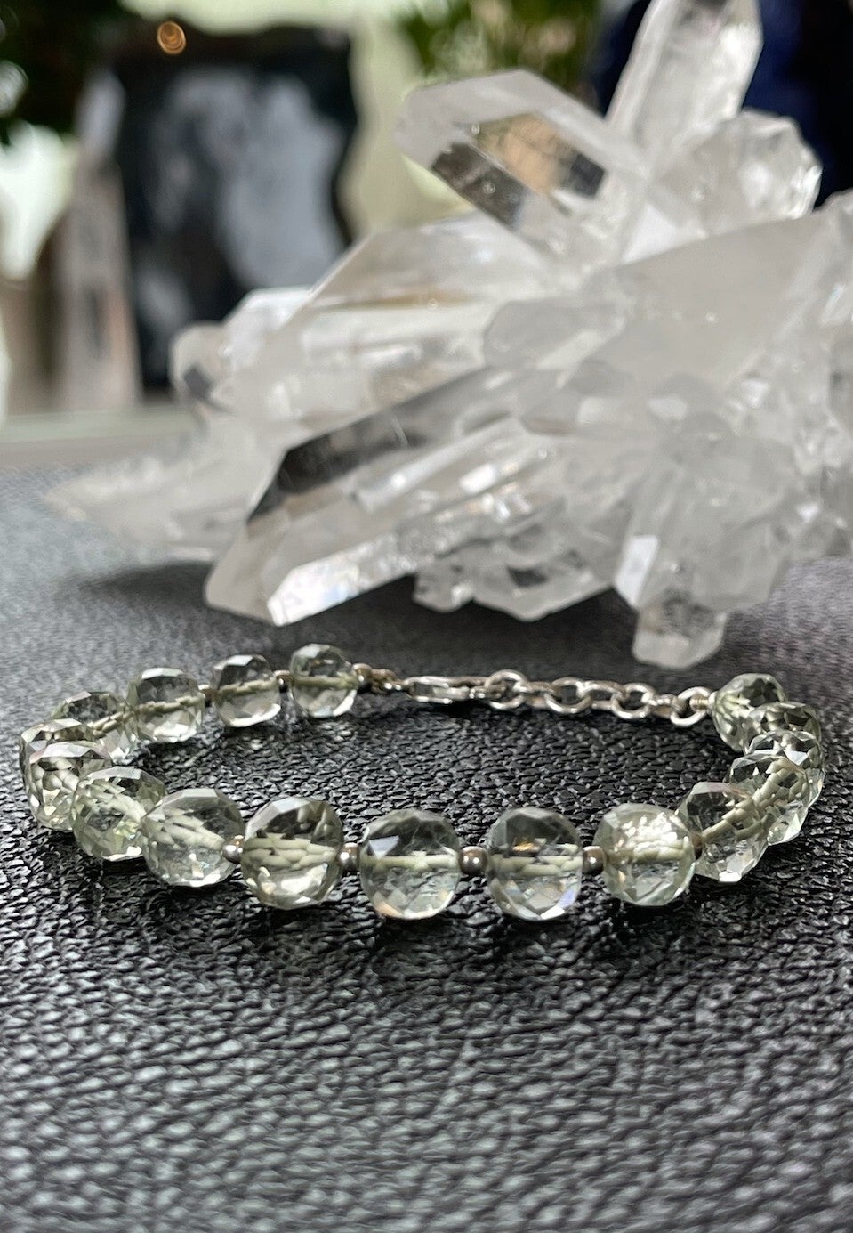 Prachtige armband met groene Amethist edelstenen, facet geslepen kralen met zilveren kralen ertussen en met zilveren sluiting, verstelbaar in lengte