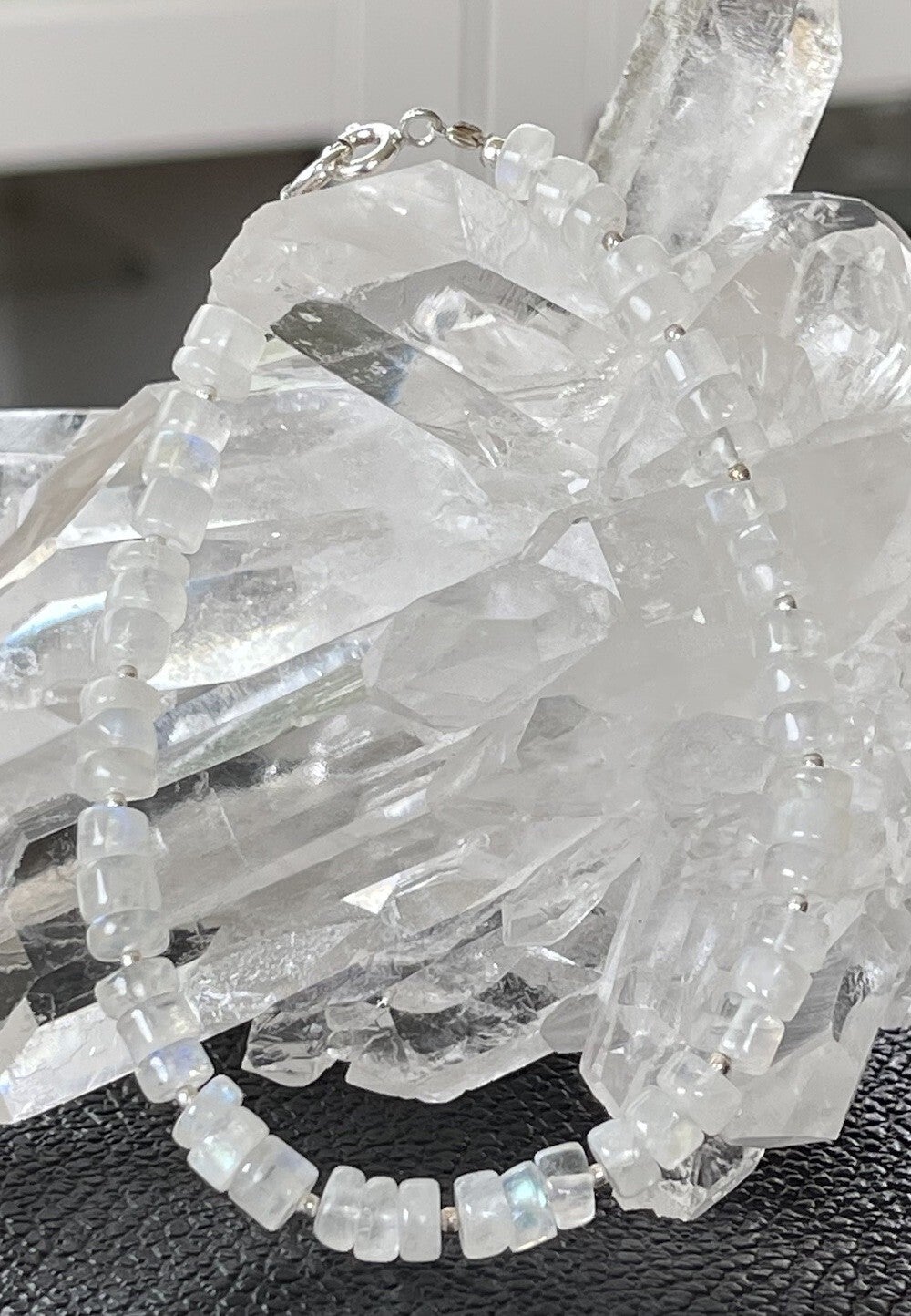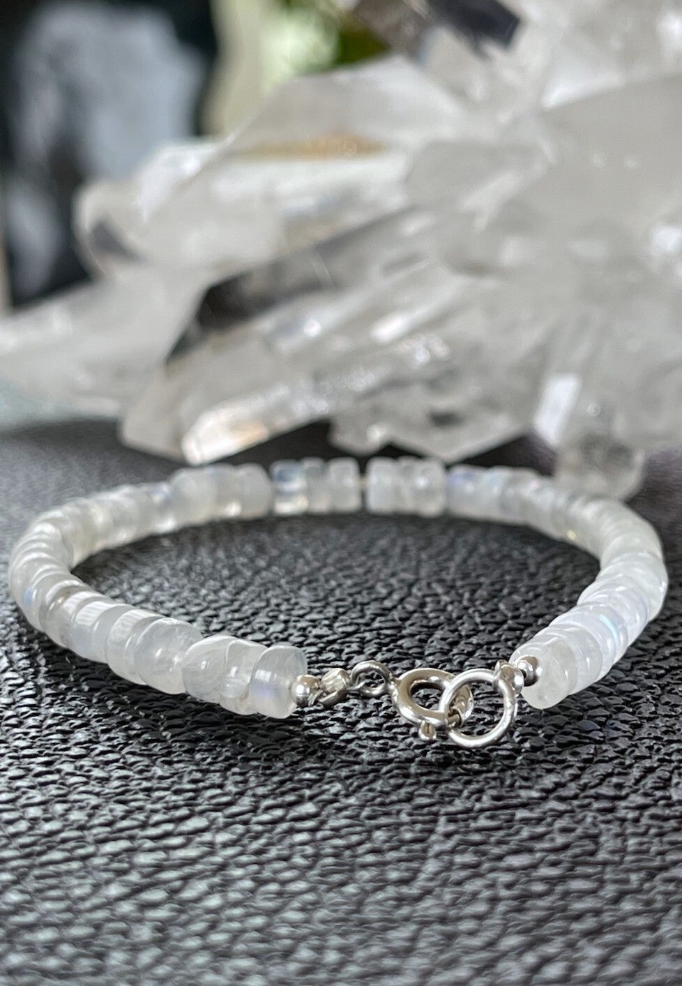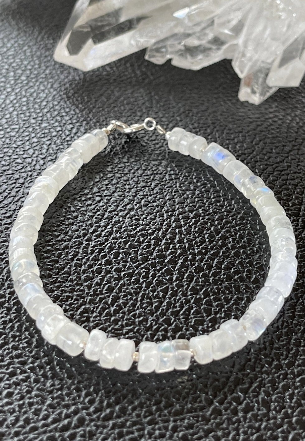 Armband met Regenboog Maansteen edelstenen met button platte cabochon kralen met zilveren bolletjes en zilveren sluiting