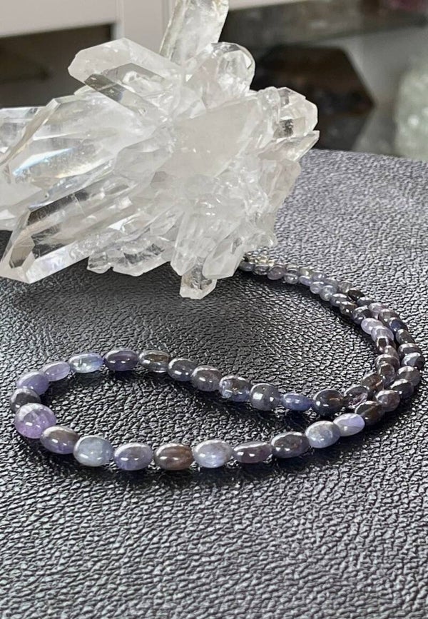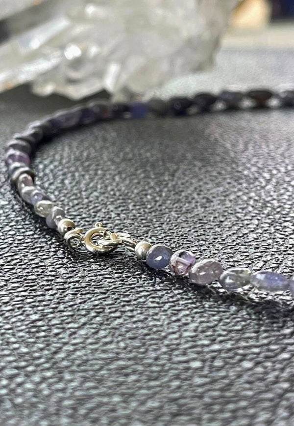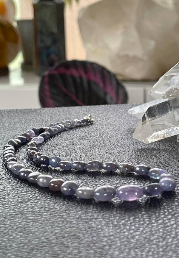 Ketting met prachtige natuurlijke kleur Ioliet edelstenen, cabochon kralen en zilveren sluiting