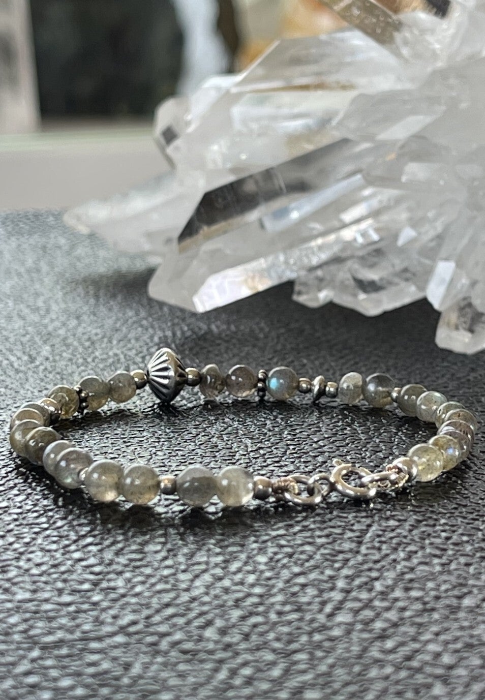 Armband met Labradoriet edelstenen, ronde cabochon kralen met bewerkte zilveren kralen ertussen en met zilveren sluiting