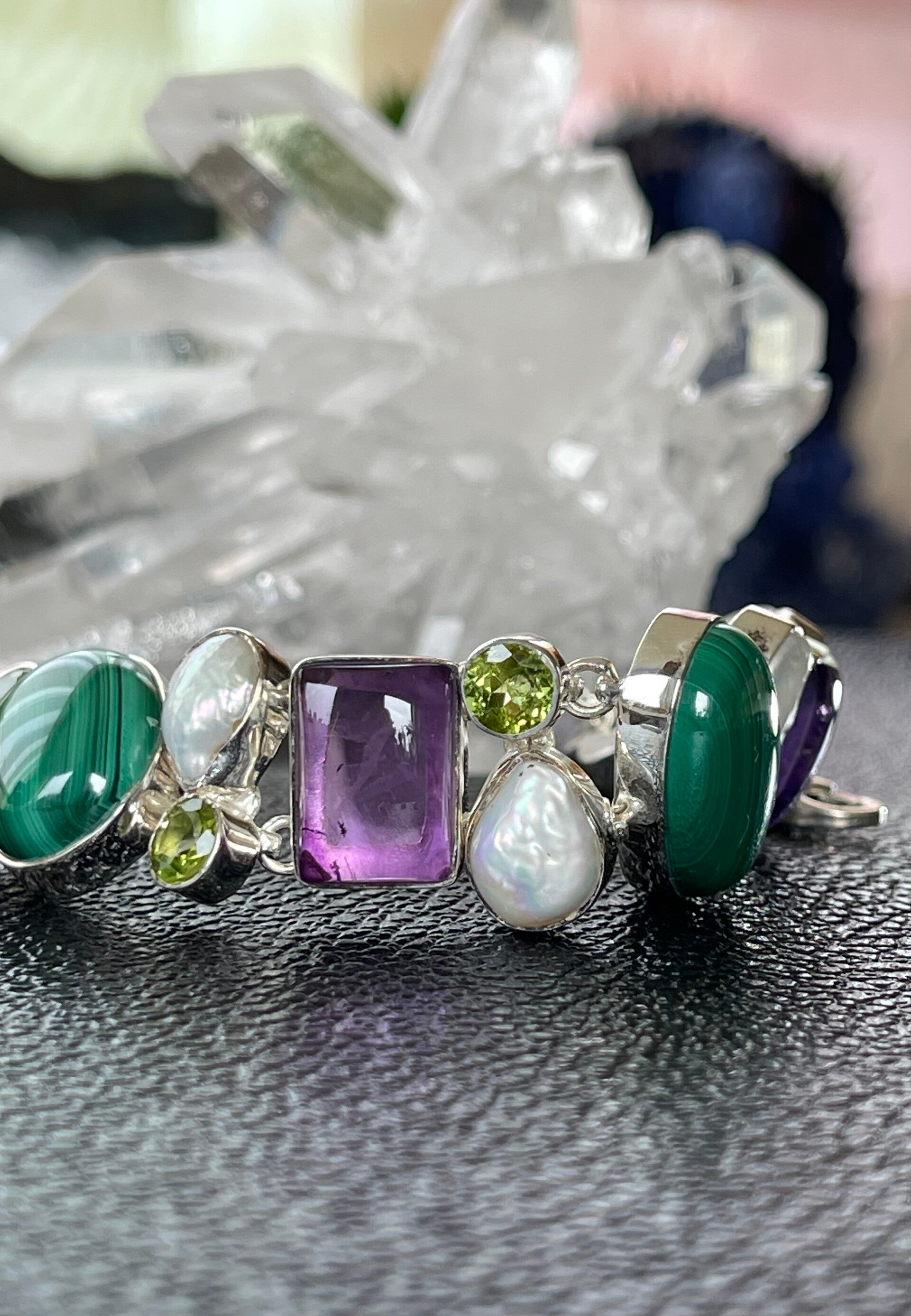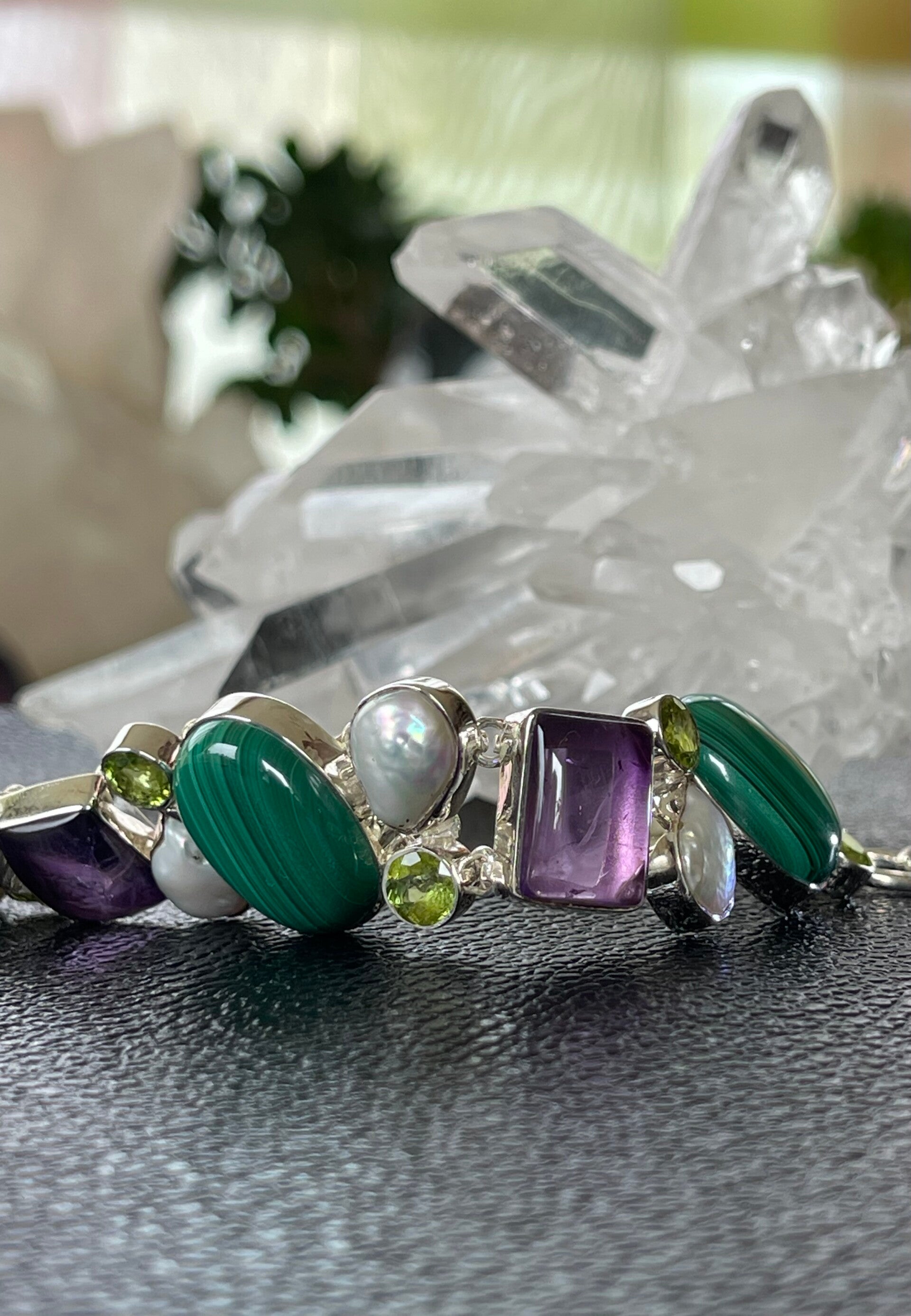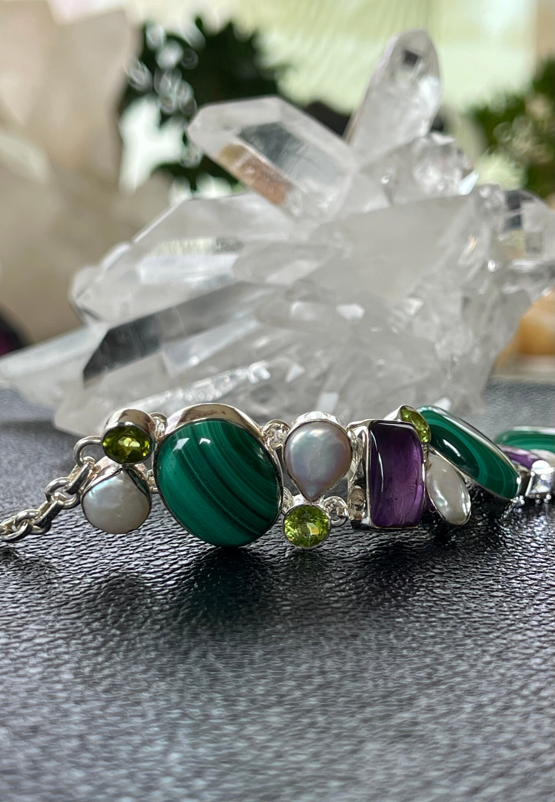 Met Amethist, Malachiet, Peridoot, Parel, edelstenen