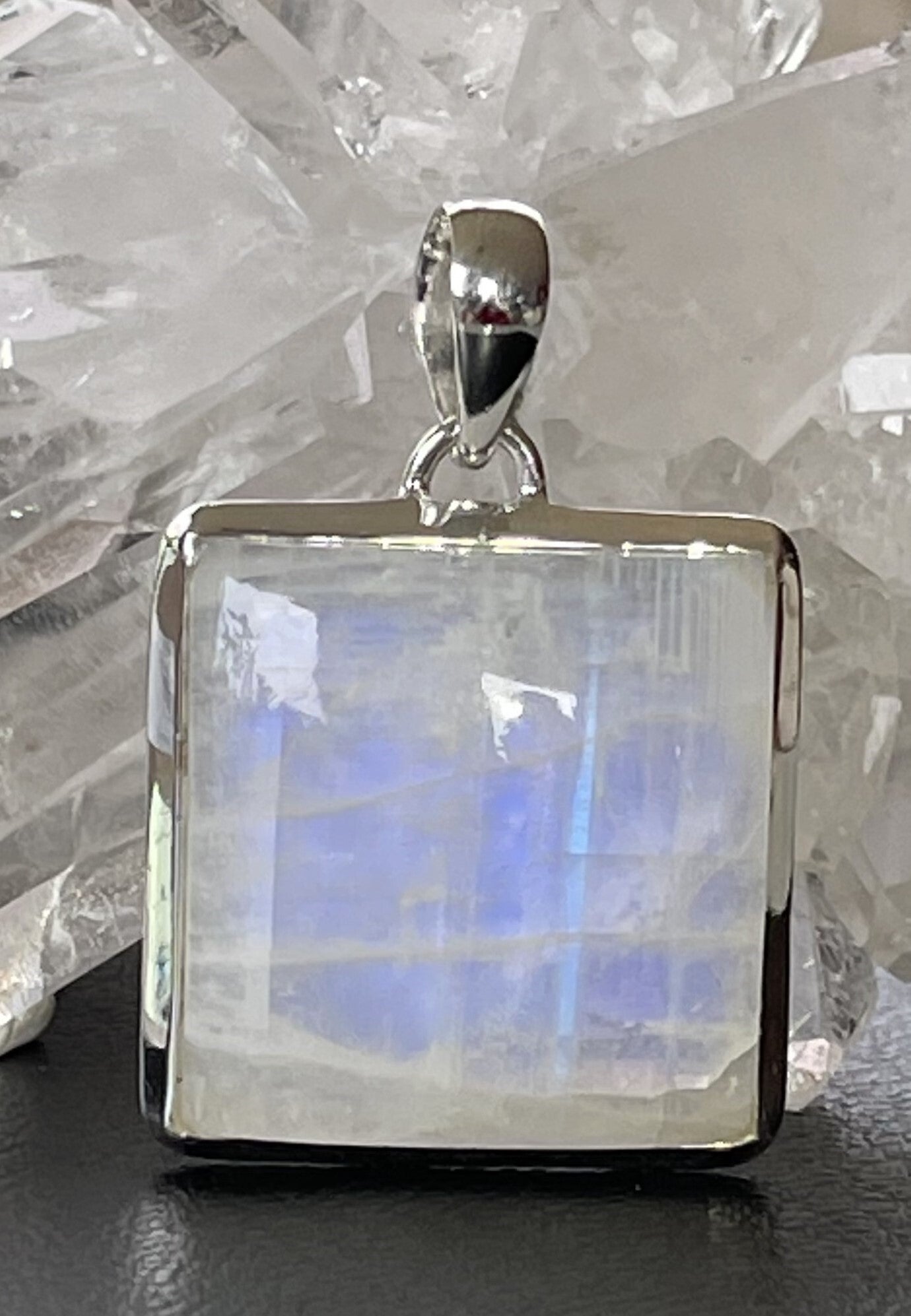 Zilveren hangertje met Regenboog Maansteen edelsteen, cabochon rechthoek, medium