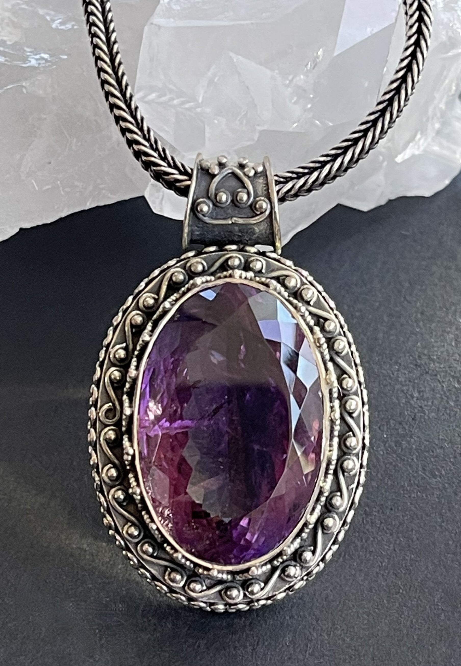 Zilveren hangertje met grote Amethist edelsteen facet geslepen groot. Het zilver is prachtig met de hand bewerkt. De prijs is zonder ketting.