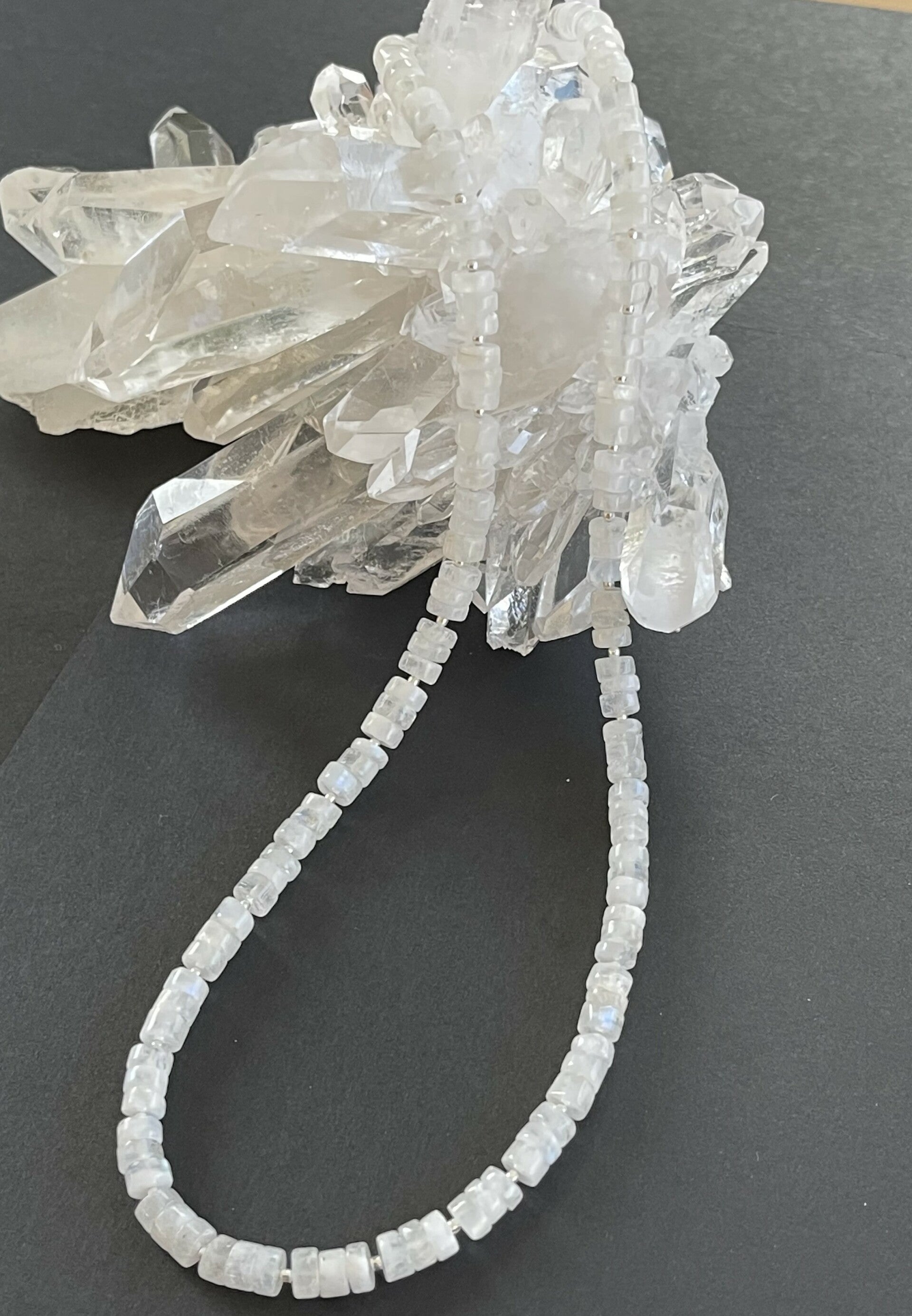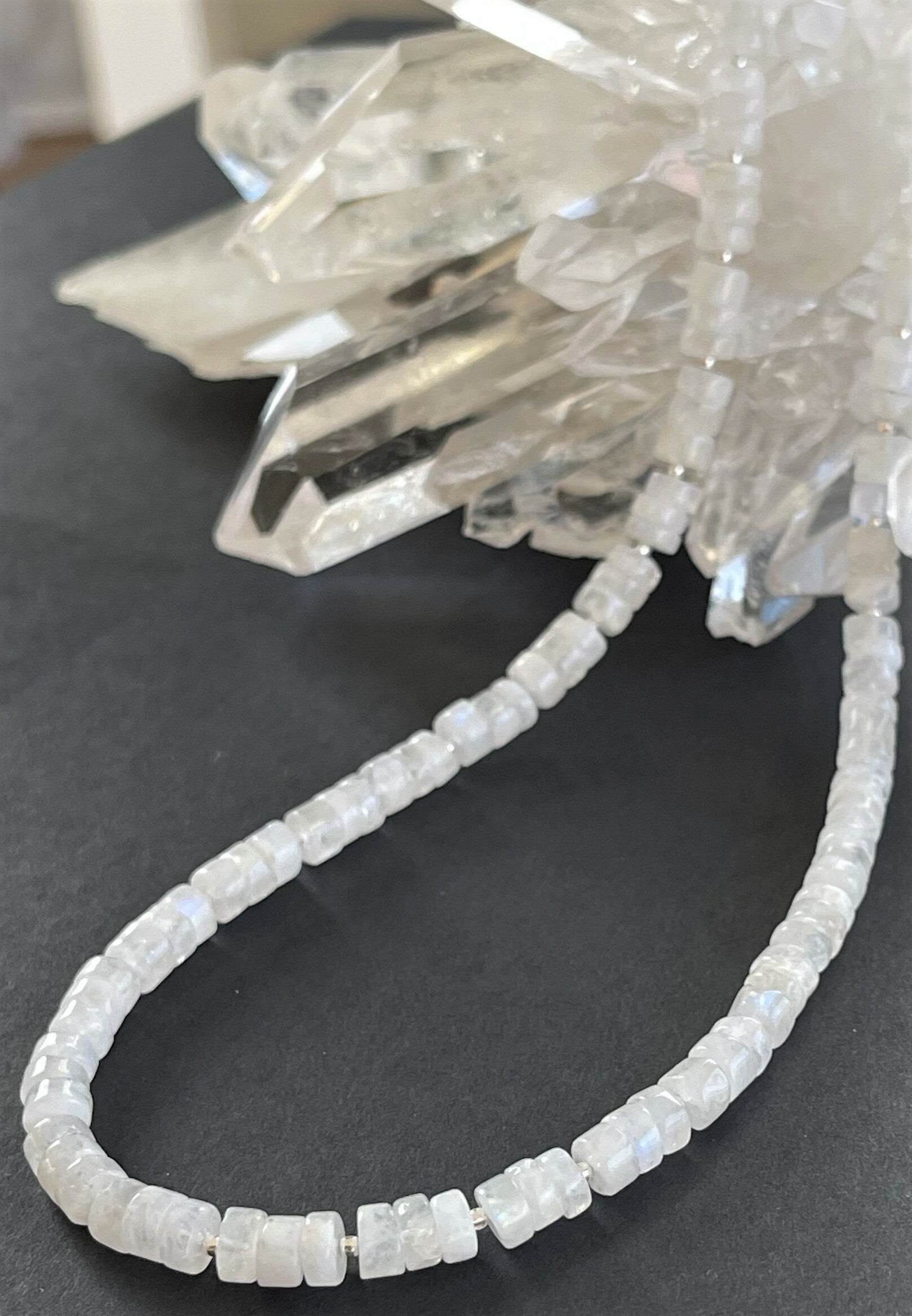 Ketting met Regenboog Maansteen edelstenen, platte ronde button cabochon kralen met zilveren bolletjes en sluiting