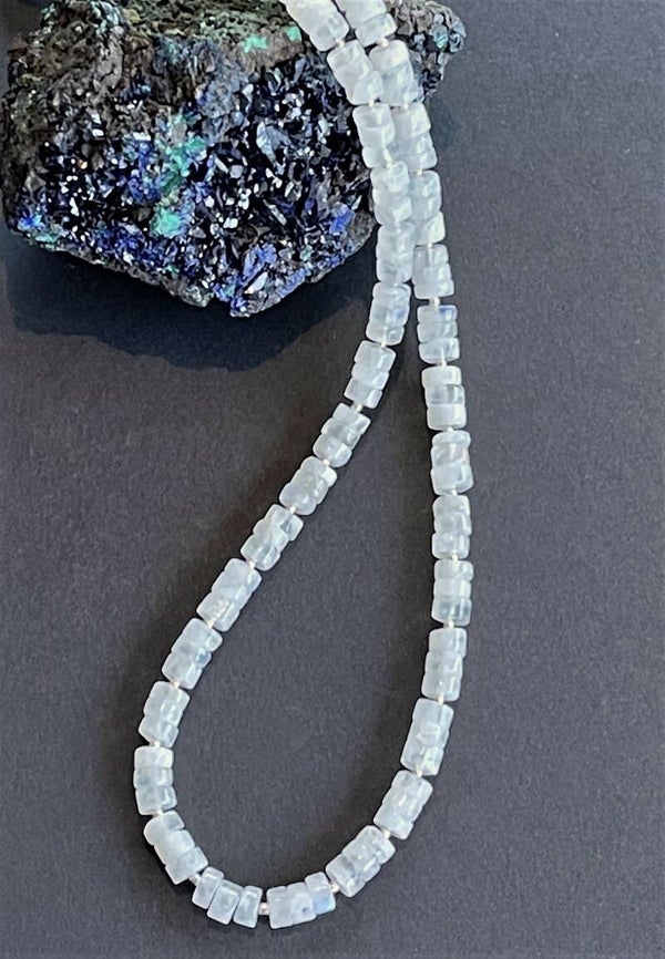 Ketting met Regenboog Maansteen edelstenen, platte ronde button cabochon kralen met zilveren bolletjes en sluiting