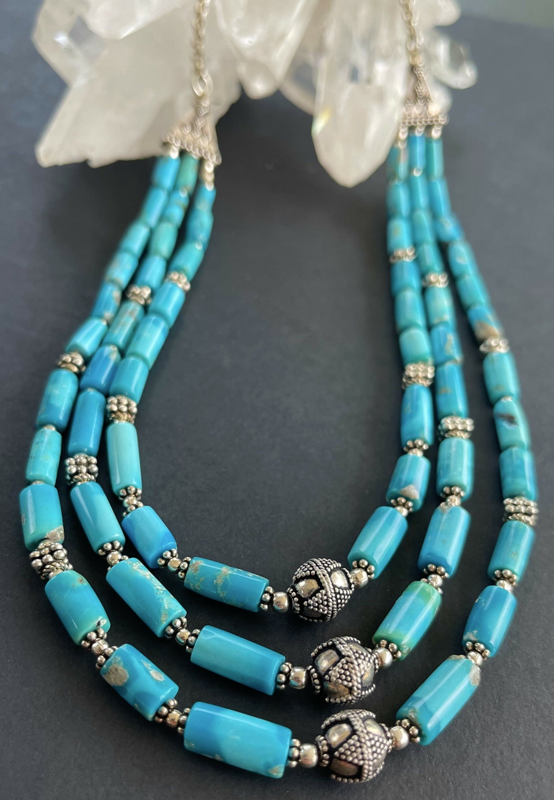 Ketting met Turkoois edelstenen cabochon pijpjes en zilveren accenten, 3 lijnen, met zilveren sluiting