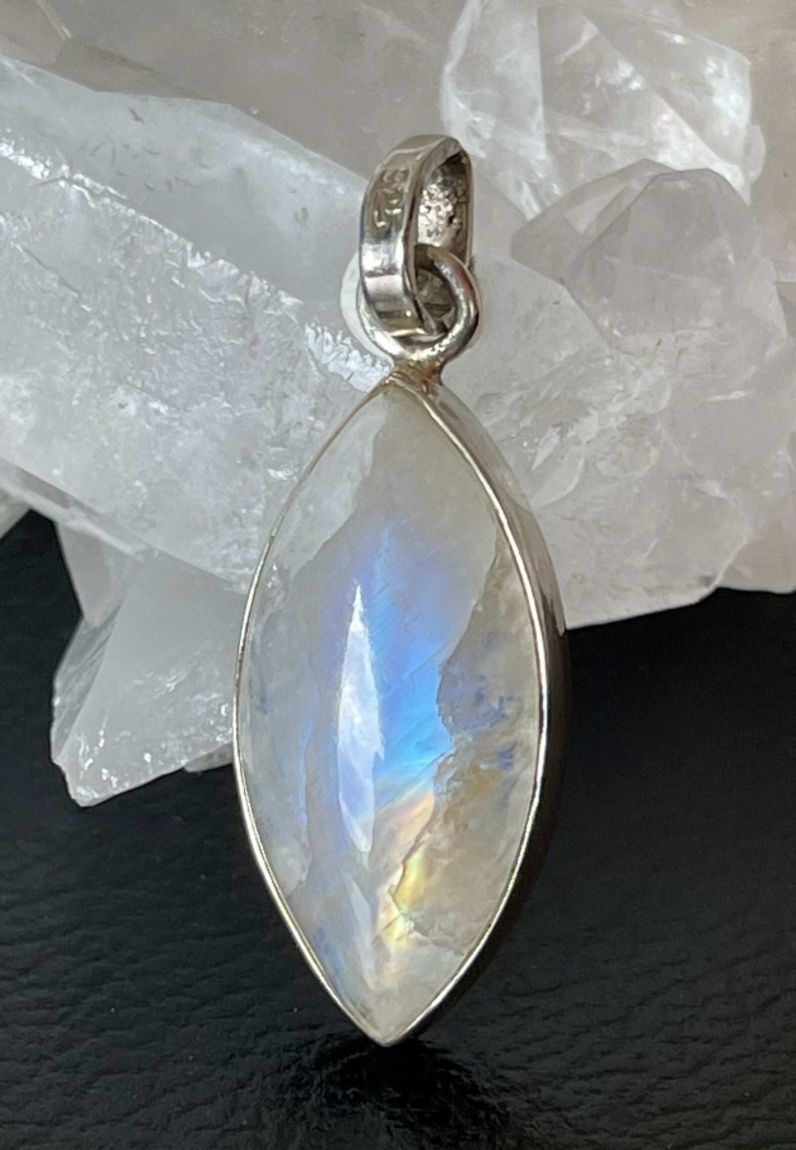Zilveren hangertje met Regenboog Maansteen edelsteen, cabochon markies-vorm, medium