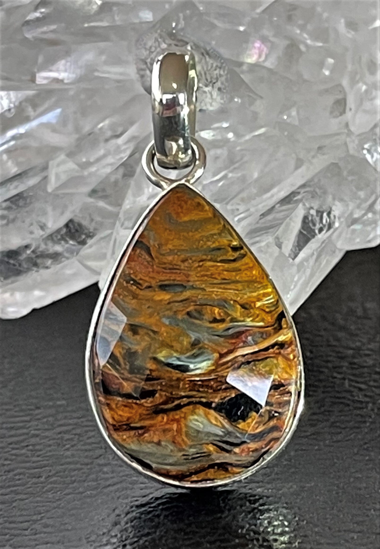 Zilveren hanger met prachtige bruine Pietersiet edelsteen, facet geslepen druppel, medium
