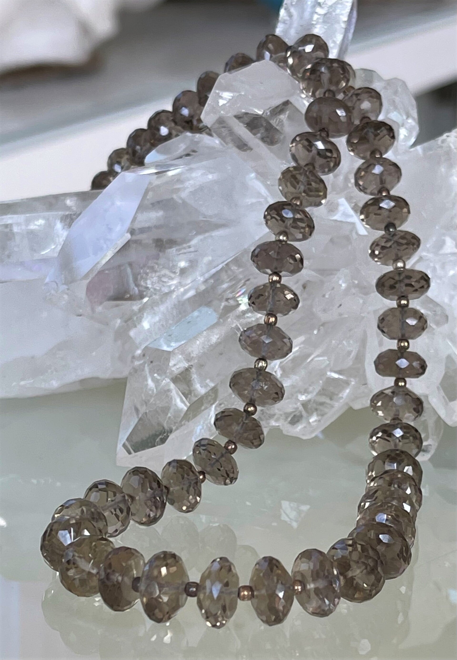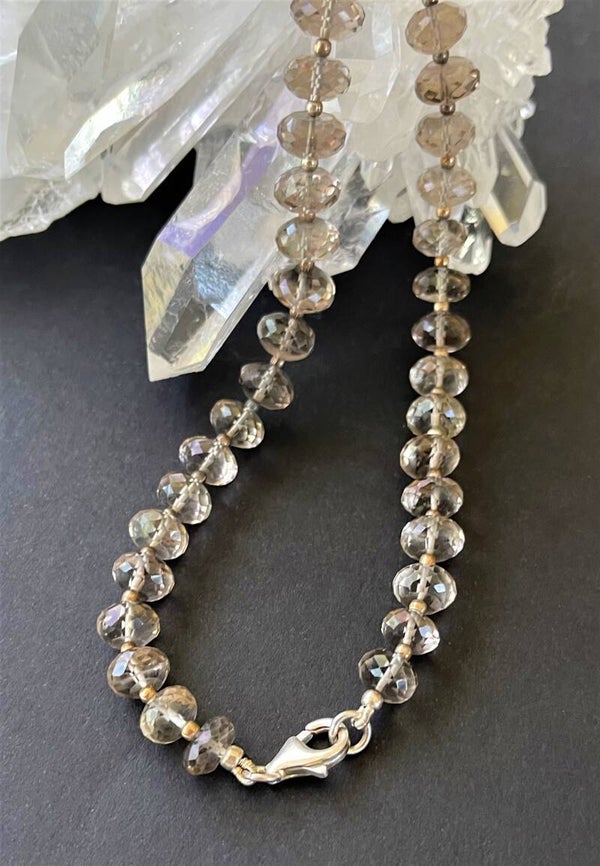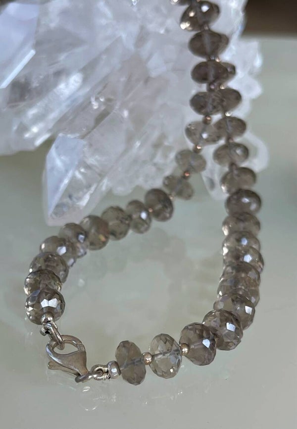 Ketting met mooie lichte kleur Rookkwarts edelstenen, facet geslepen kralen en zilveren bolletjes en zilveren sluiting