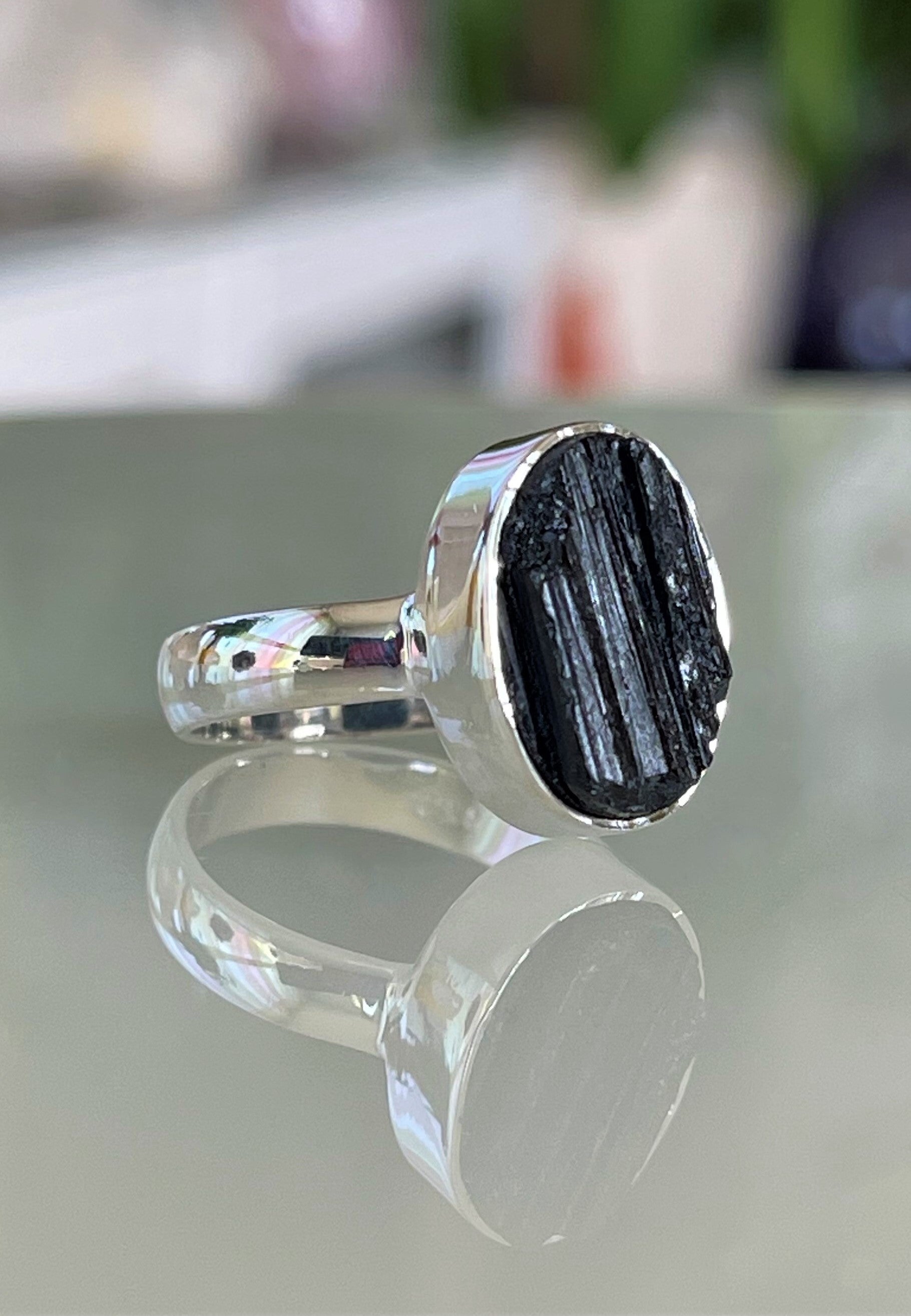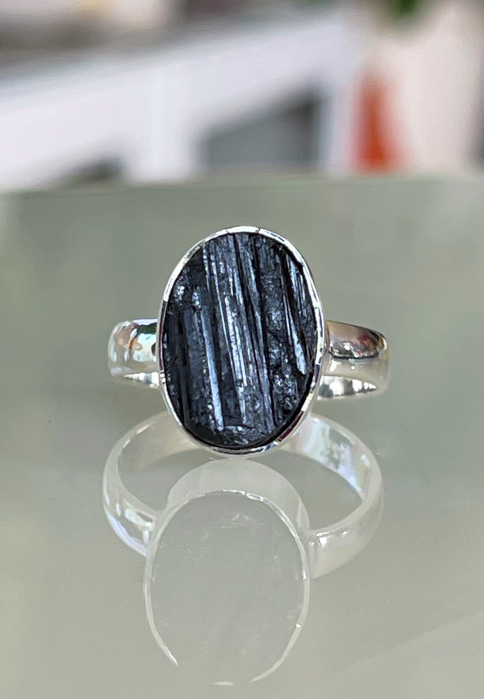 Zwarte Toermalijn ring ruw ovaal, maat 17,6