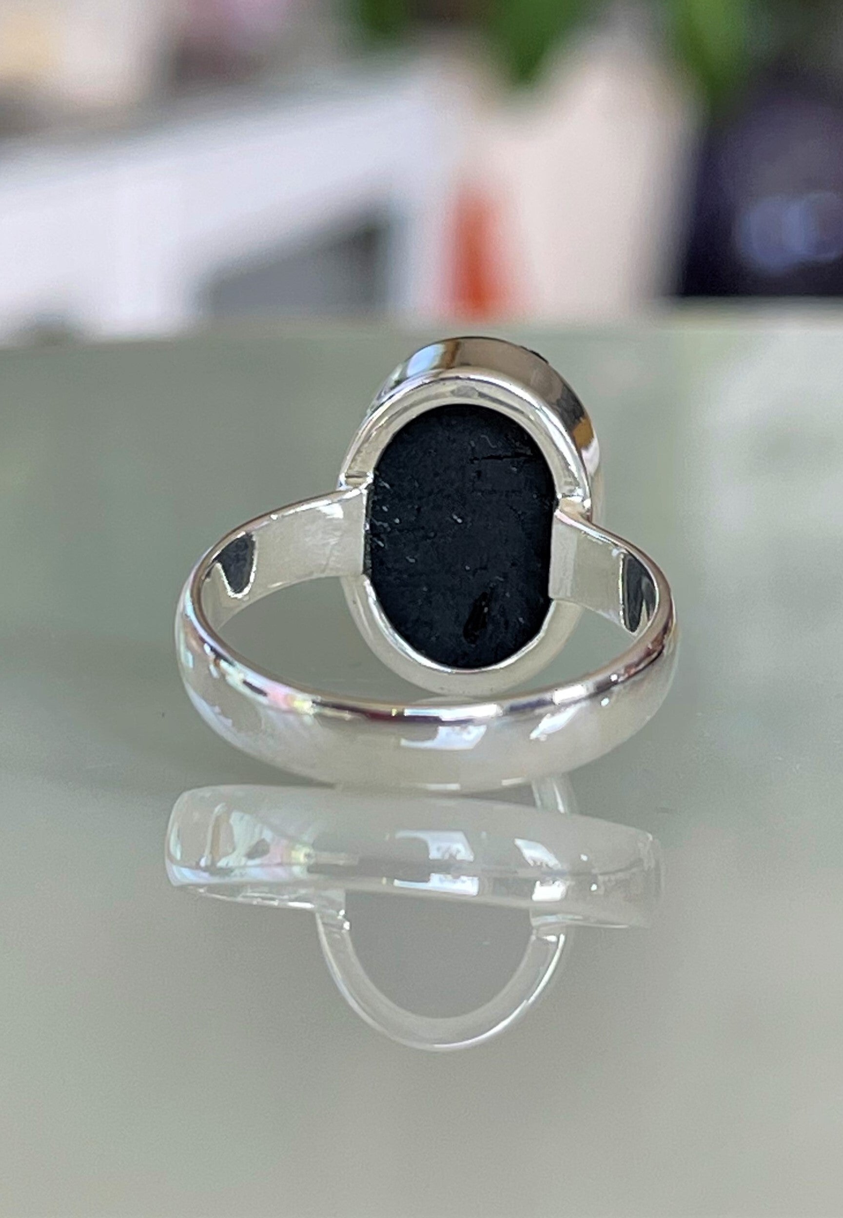 Zilveren ring met zwarte Toermalijn edelsteen, ruwe bovenkant, ovaal