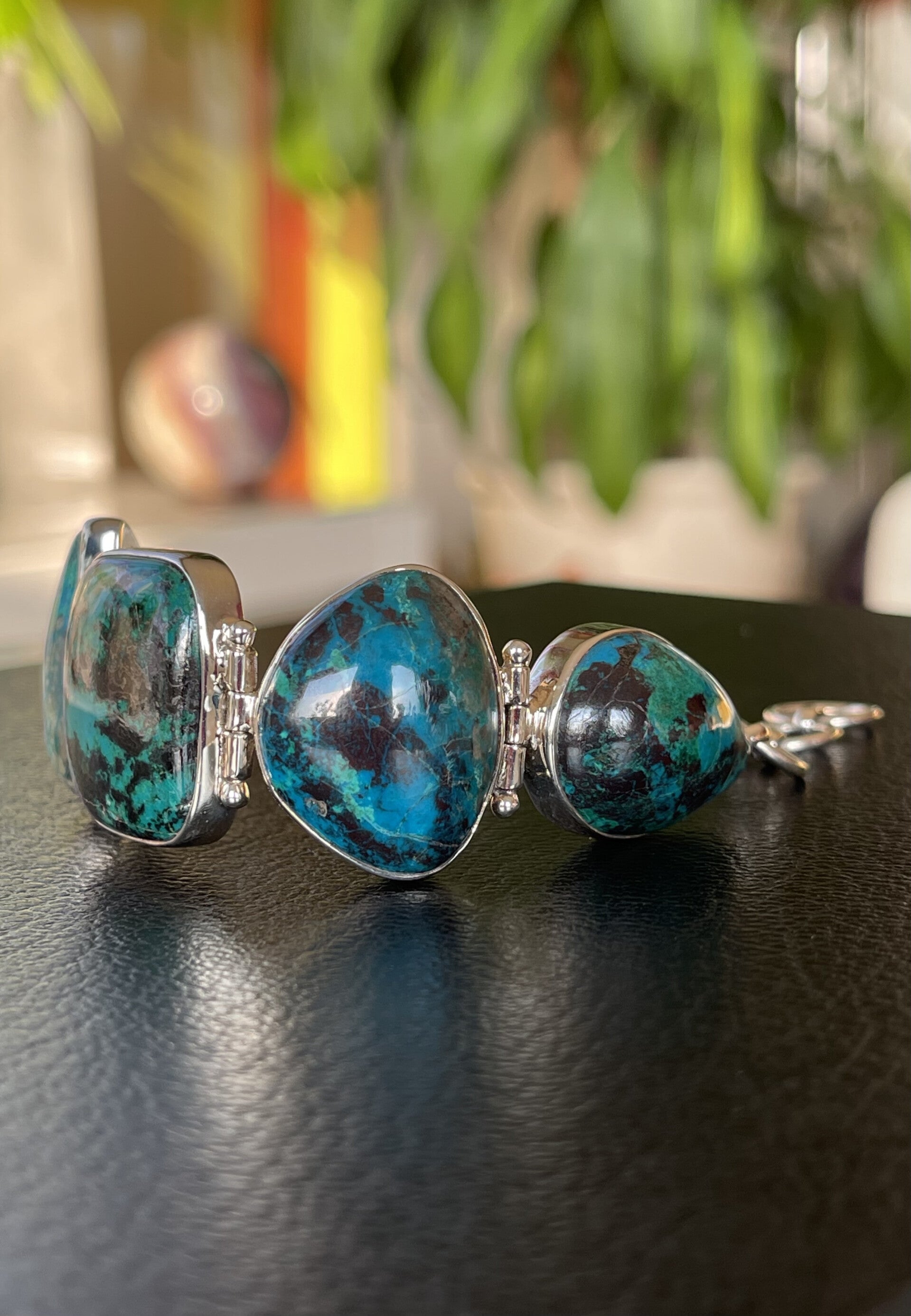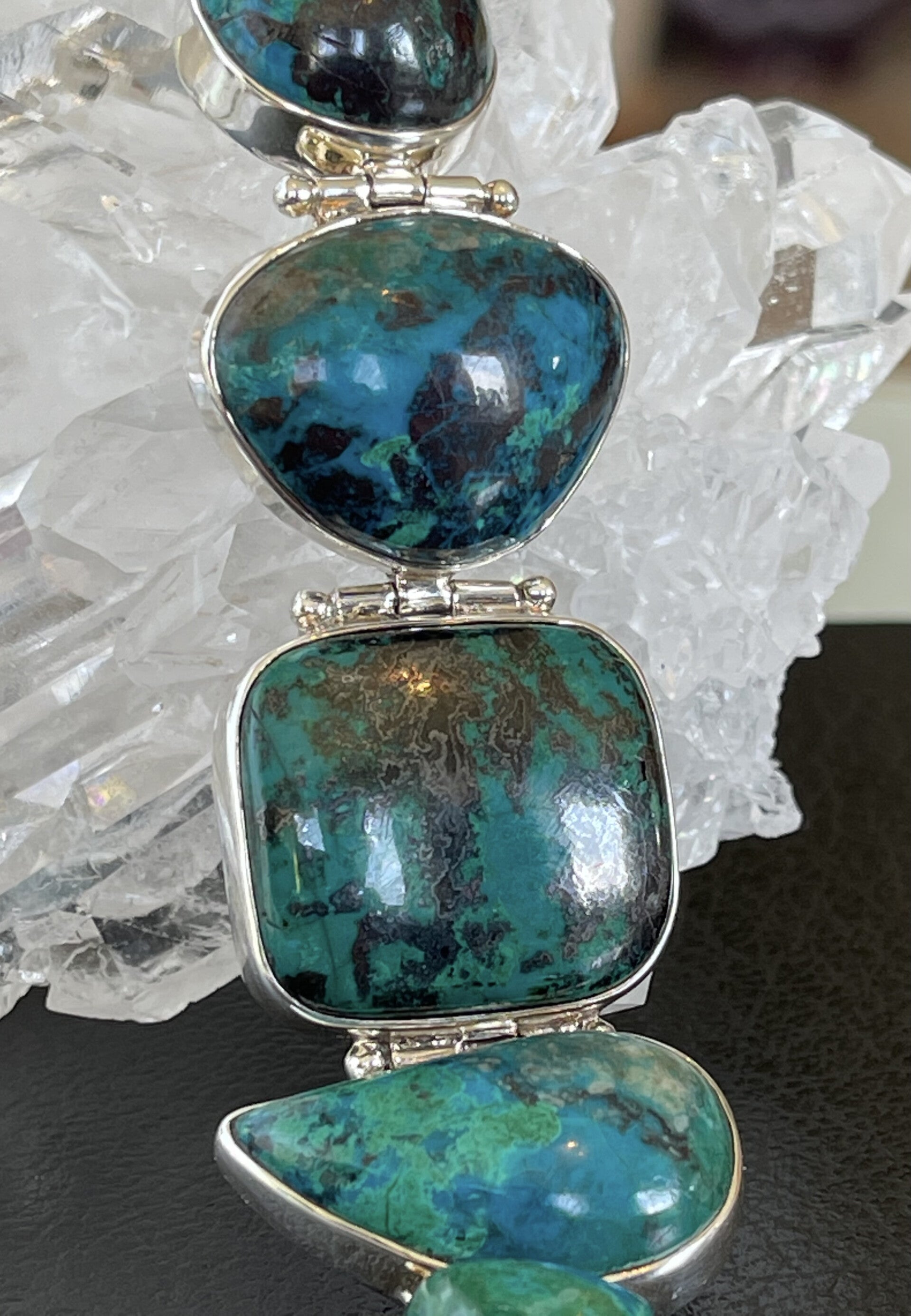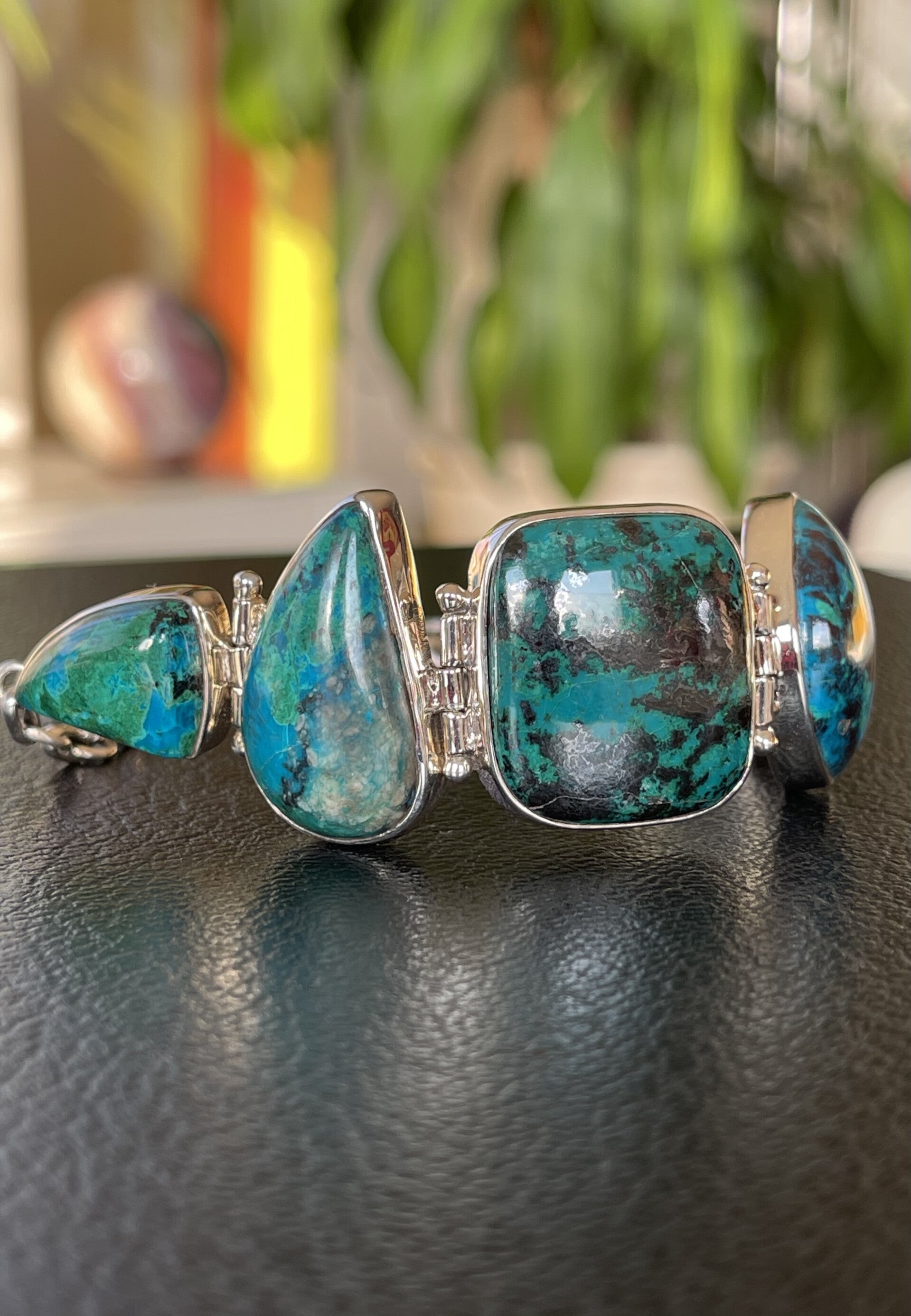 Zilveren armband Chrysocolla edelstenen cabochon free form, korter verstelbaar in lengte