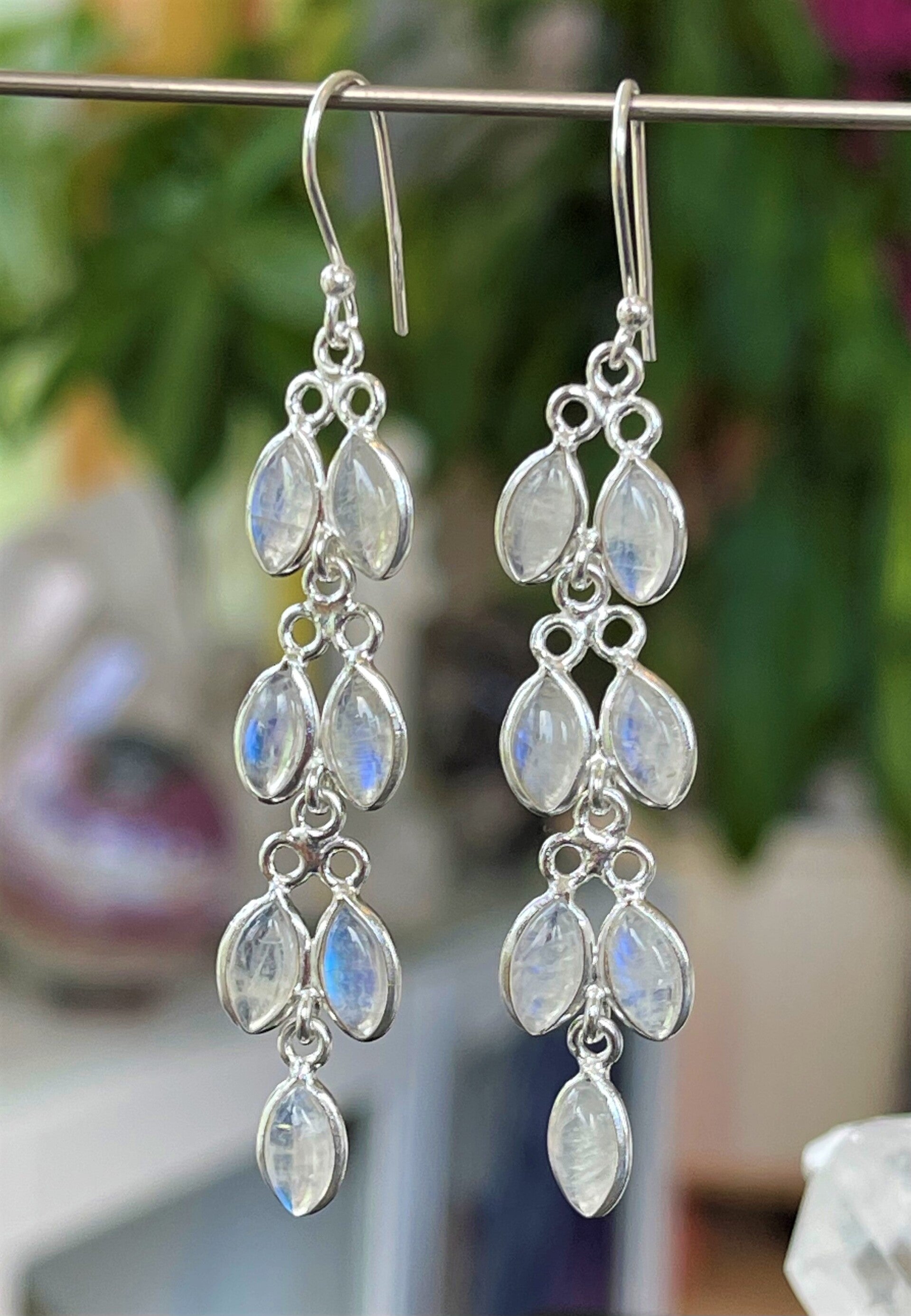Regenboog Maansteen oorbellen cabochon marquise vorm, lang