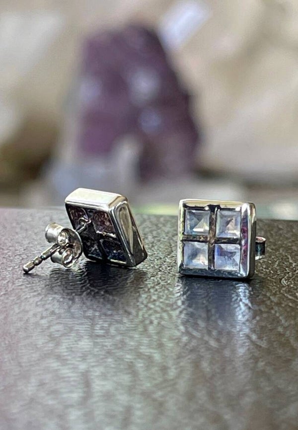 Zilveren oorstekers met Regenboog Maansteen edelstenen facet geslepen vierkant