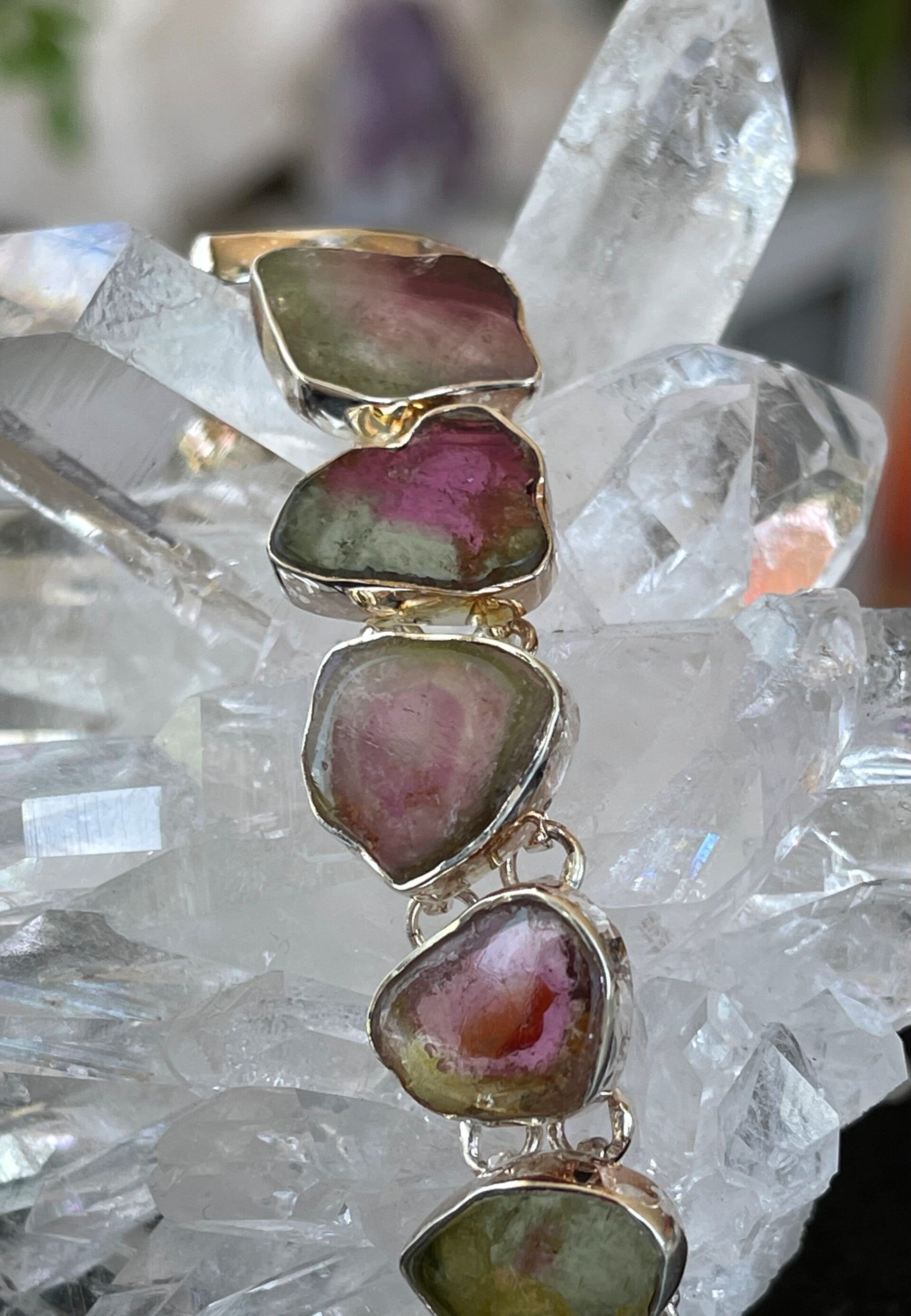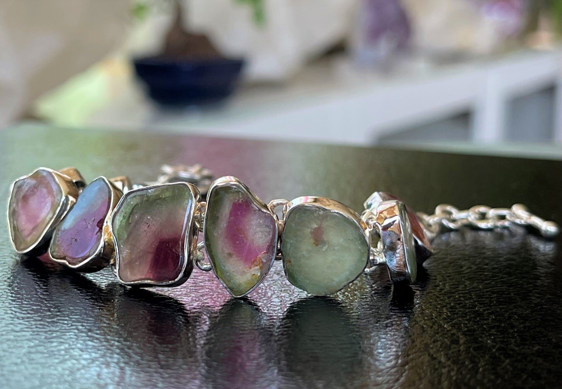 Zilveren armband met Watermeloen Toermalijn edelstenen cabochon free form, korter verstelbaar in lengte