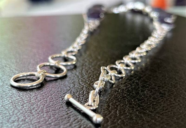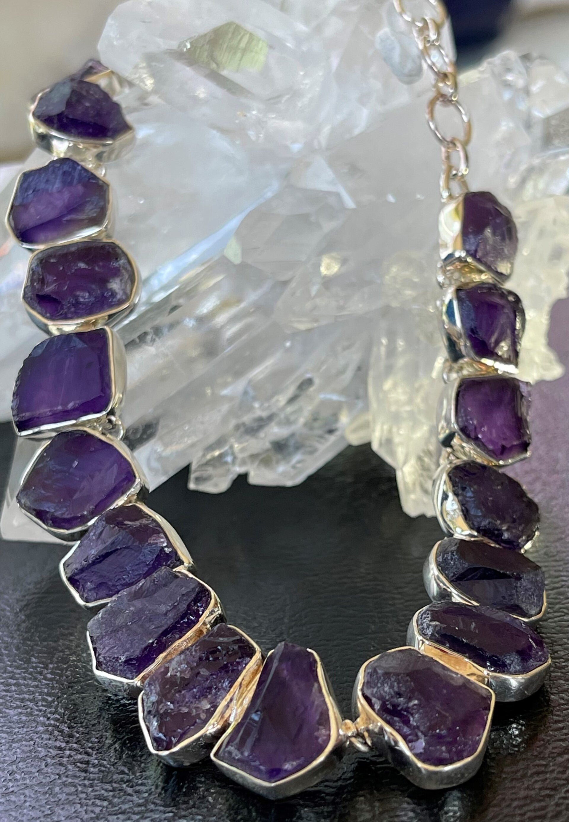 Prchtige unieke zilveren ketting met ruwe Amethist edelstenen free form, korter verstelbaar in lengte