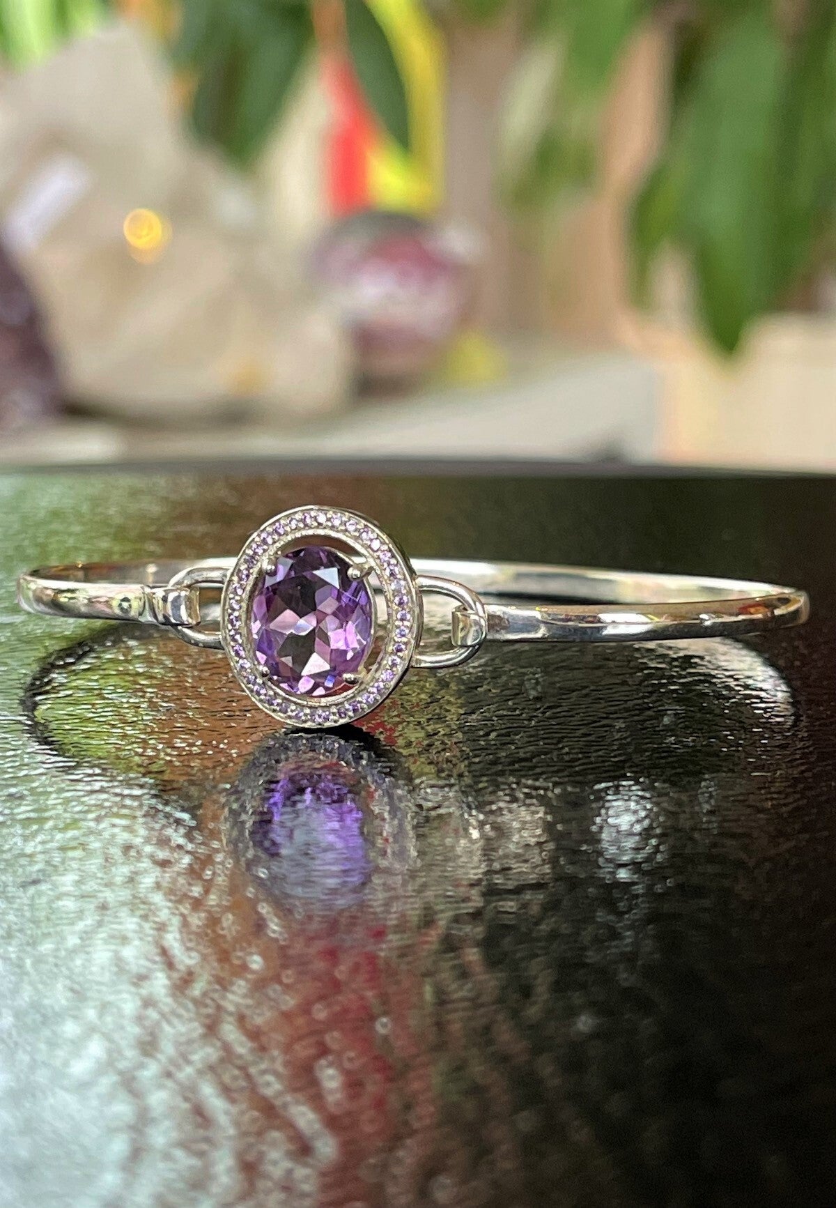 Zilveren armband, in de vorm van een bangle, met 1 grote Amethist edelsteen ovaal facet geslepen en met kleine Amethist edelsteenjes eromheen bewerkt