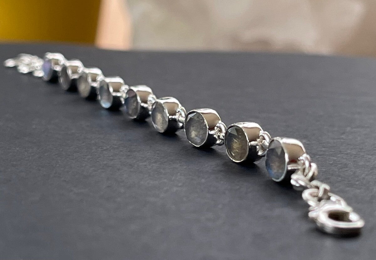 Zilveren armband met Labradoriet edelstenen facet geslepen ovaal vorm, verstelbaar naar kortere lengte