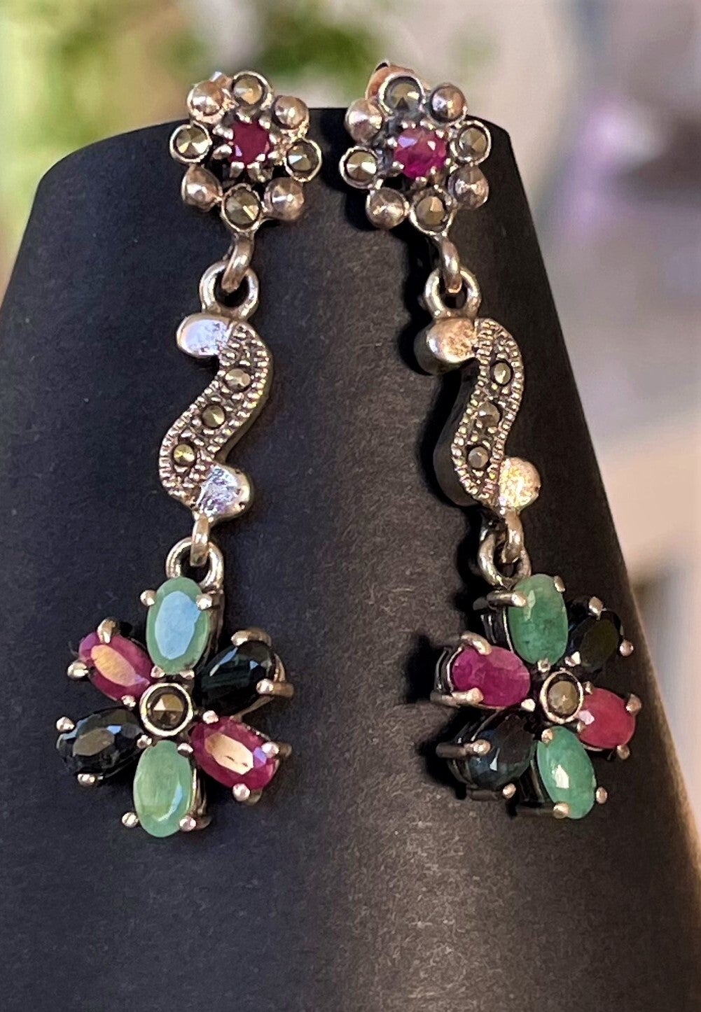 Zilveren ketting en oorbellen met Saffer, Smaragd en Robijn facet geslepen, set