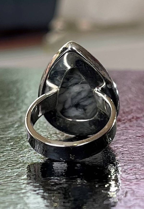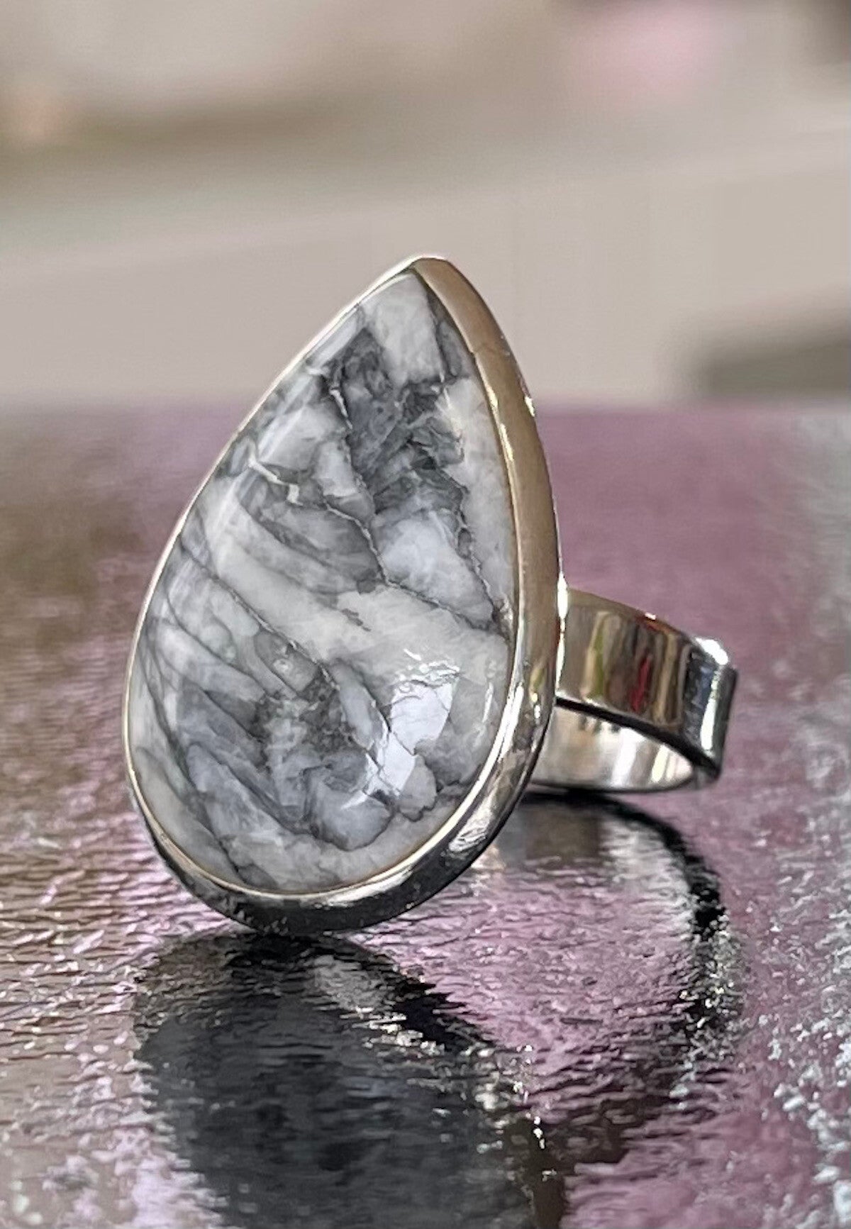 Zilveren ring met Pinoliet edelsteen cabochon druppel, uit Oostenrijk, ook wel Edelweiss Magnesiet genoemd